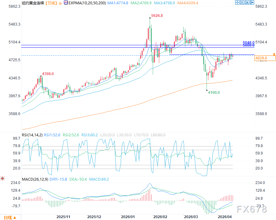 若多头意外发力,强势突破周线),则短期看空观点失效,金价将再度向5000美元整数关口发起冲击;